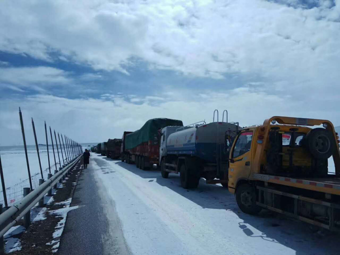 10月30日,司機抵達格爾木,繼續(xù)往前進入唐古拉山。青藏線唐古拉段因為下大雪,目前造成路邊結冰。由于道路狹窄,數百輛卡車被堵在路上,情況緊急。由于唐古拉段海拔高,氣溫低,卡車司機只能使用車輛只有的暖風系統(tǒng)進行取暖。但是由于堵車時間長,部分車輛已經出現柴油不足的情況。部分司機車內已經沒有食物,更有甚者出現無法取暖的情況,據卡友透露,已經有部分司機出現高反,情況十分危急。